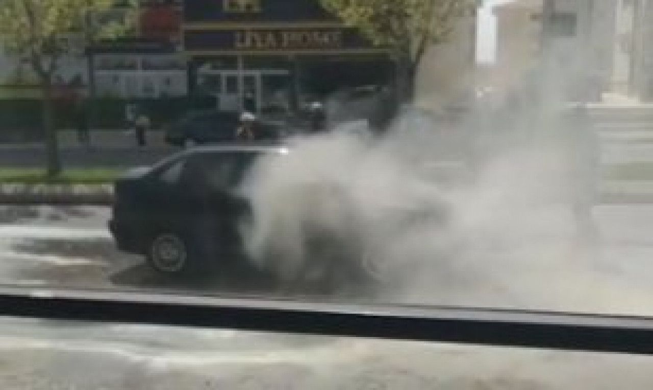 kısmında yangın çıktı. Otomobilden çıkan duman ve alevlere ilk müdahaleyi