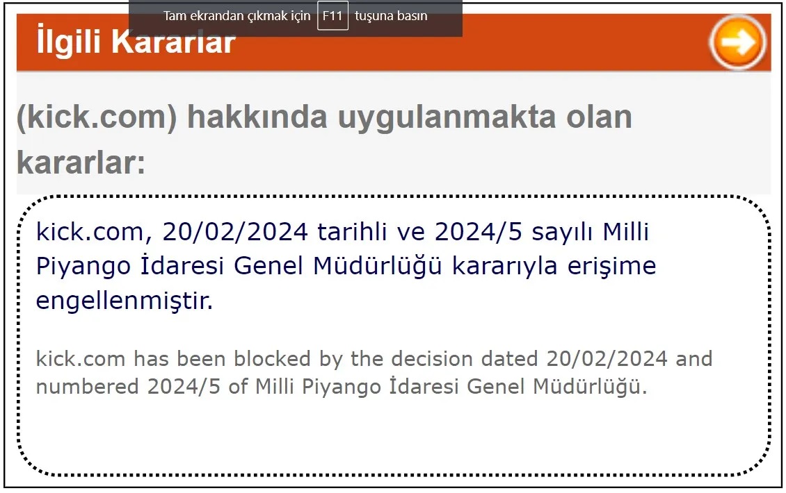 Konu hakkındaki resmi açıklamada, "Kick.com, 20/02/2024 tarihli ve 2024/5 sayılı Milli Piyango İdaresi Genel Müdürlüğü kararıyla erişime engellenmiştir" ifadelerine yerdi.