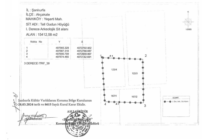 Akçakale ilçesine bağlı Yeşerti Mahallesinde özel mülkiyet ile maliye hazinesine ait alanda bir kısmı kalan Tell Gudun Höyüğü 1. derece arkeolojik sit alanı ilan edildi.