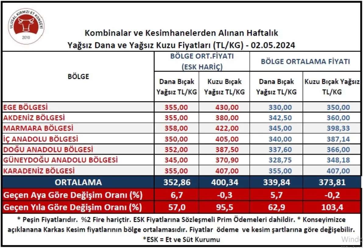 Ulusal Kırmızı Et Konseyi (UKON), haftalık karkas et fiyatlarını yayınladı. Mayıs ayı ilk haftası bölgeler arası ortalama kesim fiyatlarına göre, dana kesim fiyatı 358 liradan 352 liraya, kuzu kesim fiyatı da 413 liradan 400 liraya geriledi. Buna göre dana kesim fiyatı 6 lira, kuzu kesim fiyatı da 14 lira düştü.