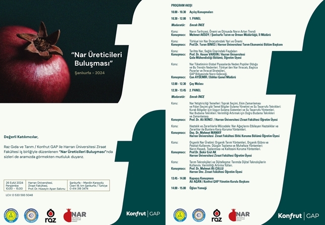 Programa Ziraat Fakültesi akademisyenlerinin yanı sıra Şanıurfa İl Tarım ve Orman Müdürü Mehmet Aksoy il özel firmaların yekili isimleri de konuşmacı olarak katılacak. Programda narin tarihçesi, narın ihracattaki yeri ve önemi, nar yetiştirme süreci, faydaları, nar ağaçlarındaki hastalılar ve korunma yöntemleri,organik nar üretimi konuşulacak. Ayrıca tarımda dijital teknolojilerin kullanımı da yine konular arasında yer alıyor.