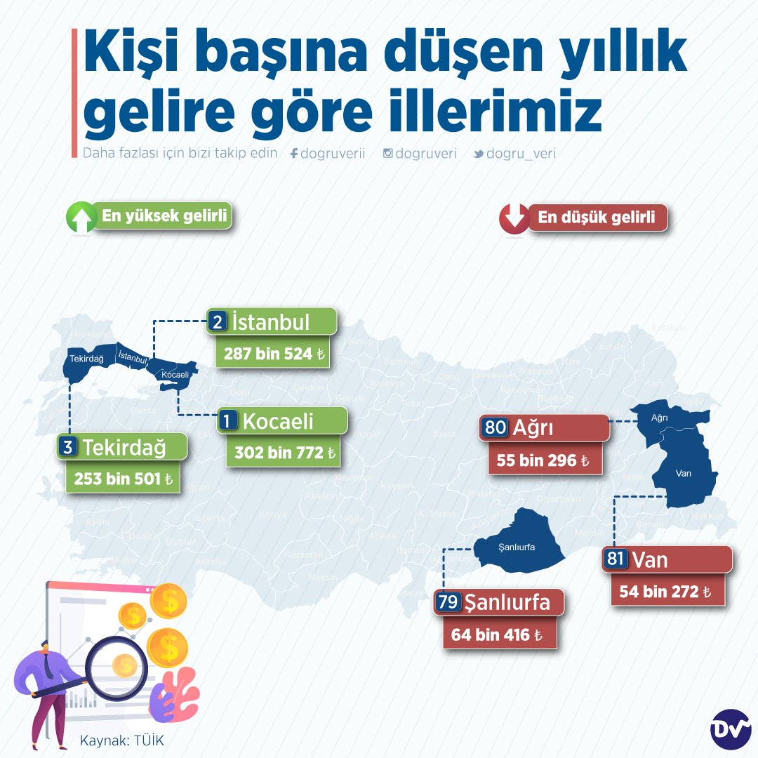 Doğru Veri internet sitesi, Türkiye İstatistik Kurumu (TÜİK) verilerine göre Türkiye'deki illerin yıllık gelir sıralamasını derledi.