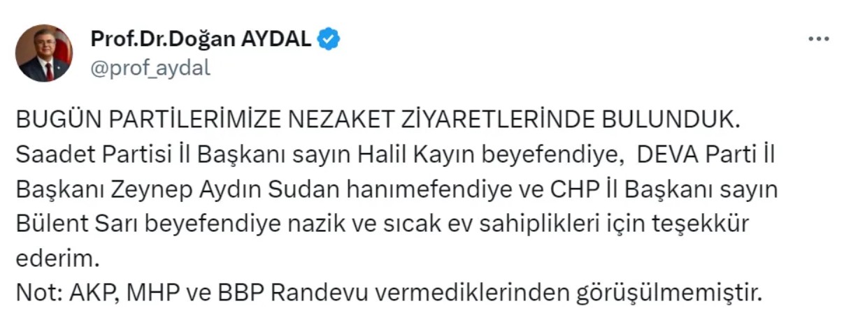 Yeniden Refah Partisi Kocaeli Büyükşehir Belediye Başkan adayı Prof. Dr. Doğan Aydal, Saadet Partisi, DEVA Partisi ve CHP il başkanlarıyla görüşerek yerel seçimler öncesinde bilgi alışverişinde bulundu. Ancak, Aydal'ın Cumhur İttifakı partilerinden randevu taleplerine olumlu yanıt gelmedi.