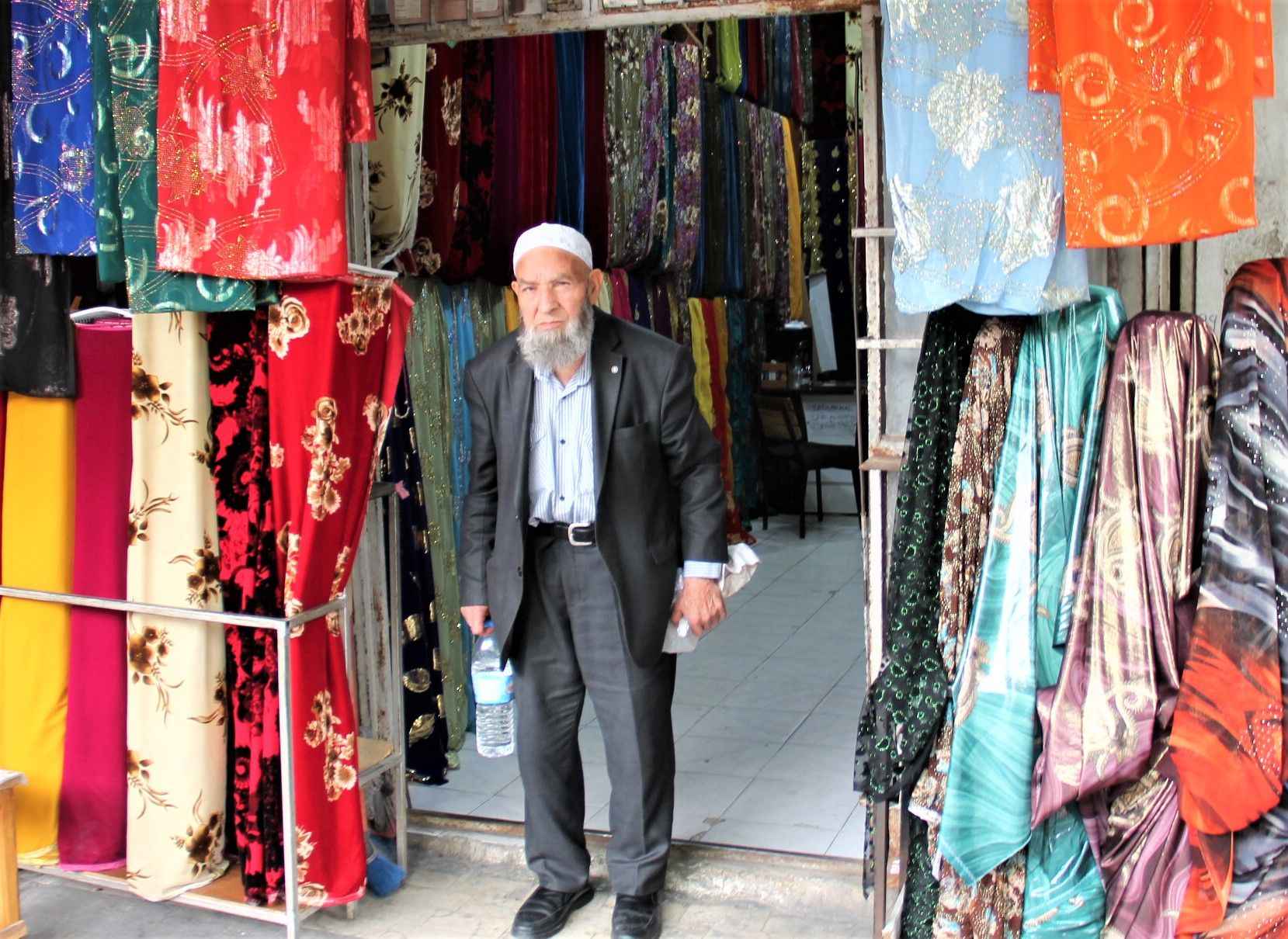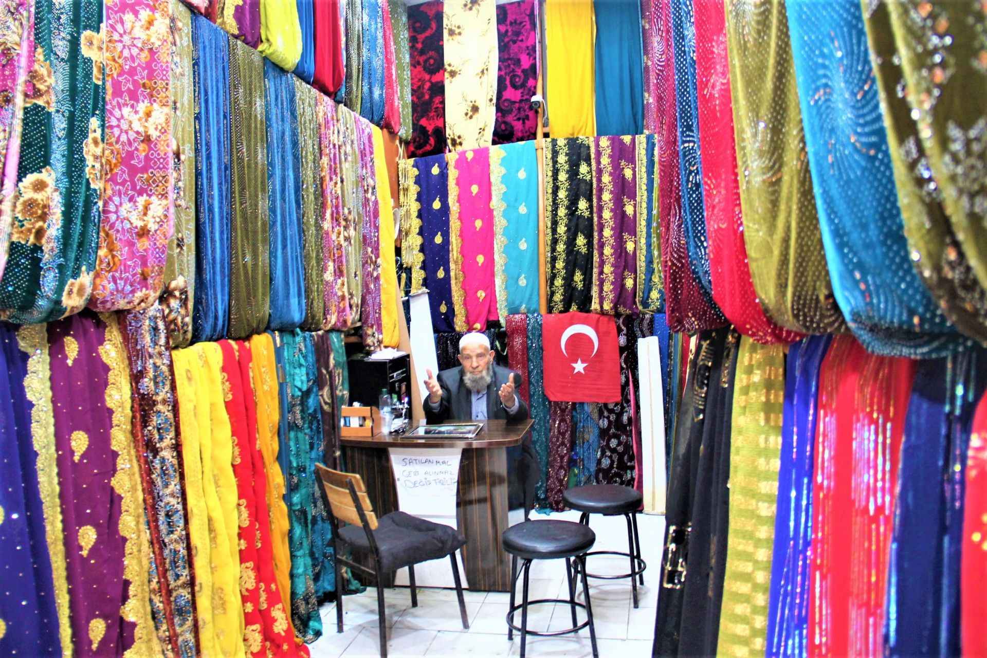 Emekli olan Hacı İmam Demir Balıklıgöl yerleşkesinde bulunan tarihi çarşılar bölgesinde çocuklarıyla birlikte yöresel kumaş satmaya başladı.