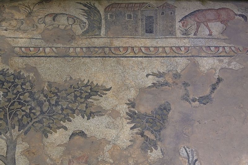 Panoyu çevreleyen bordürde ise saz çalan figürler, çiftlik evi, atlar ve diğer hayvan betimleri göze çarpıyor. Mozaikteki figürlerin yönü, avludan gelenlere doğru, doğuya dönük olarak yer alıyor.