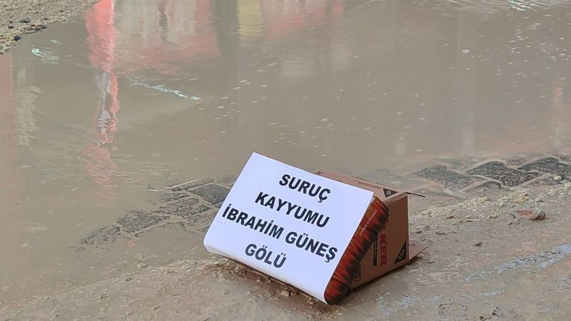 “Bugün en çok dillendirilen sorun bozuk yol sorunu oldu” diyen Şenyaşar, Destan Sokaktaki su birikintisine “Suruç kayyımı İbrahim Güneş gölü” yazılı döviz bıraktı.