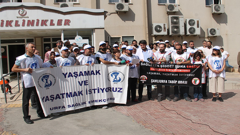 Şanlıurfa Tabip Odası ile Sağlık ve Sosyal Hizmet Emekçileri Sendikası (SES) Şanlıurfa Şubesi, Balıklıgöl Devlet Hastanesinde hemşire Mehmet Şah Bilge’nin hasta yakını tarafından darp edilmesine ilişkin basın açıklaması yaptı.