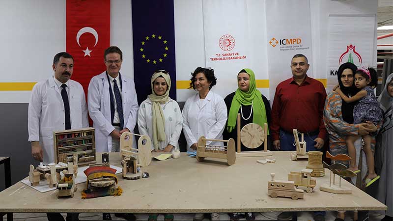 Başkan Baydilli ve Büyükelçi Meyer-Landrut’u kursiyerler tarafından yapılan ürünlerin sergisini gezerken, kursiyerlerle bir süre sohbet edip tezgahlarda oyuncak yapımı ve halı dokumayı denediler.
