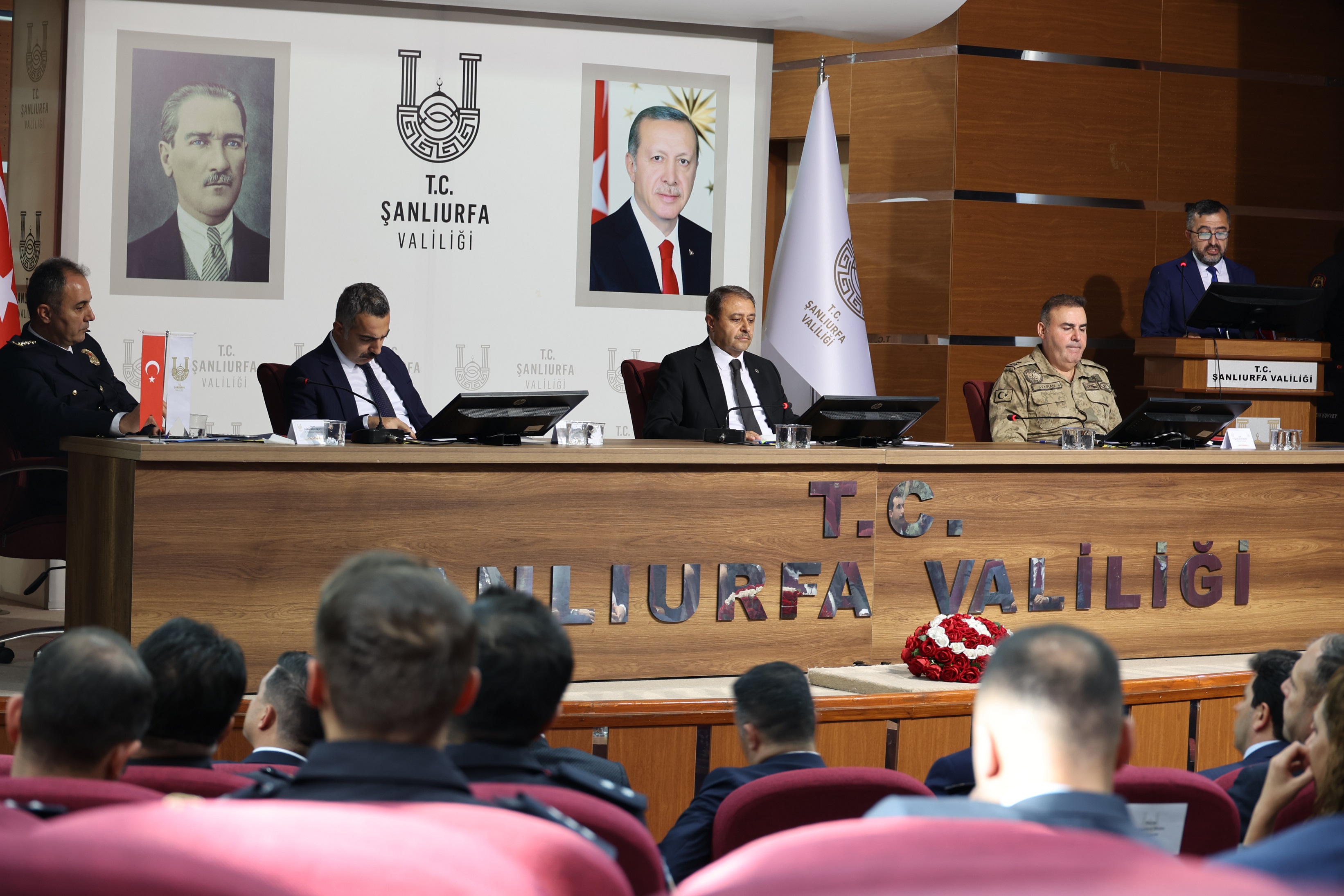 Şanlıurfa Valisi Hasan Şıldak başkanlığında, emniyetten sorumlu Vali Yardımcısı Erinç Demir, 13 İlçe Kaymakamı, İl Emniyet Müdürü Erdem Bildirici, İl Jandarma Komutanı Tuğgeneral Mücahit Avkıran, İl Emniyet Müdür Yardımcıları, İl Jandarma Komutan Yardımcıları ve İlçe Emniyet Müdürleri ile İlçe Jandarma Komutanlarının katımıyla kapsamlı bir güvenlik toplantısı gerçekleştirildi.