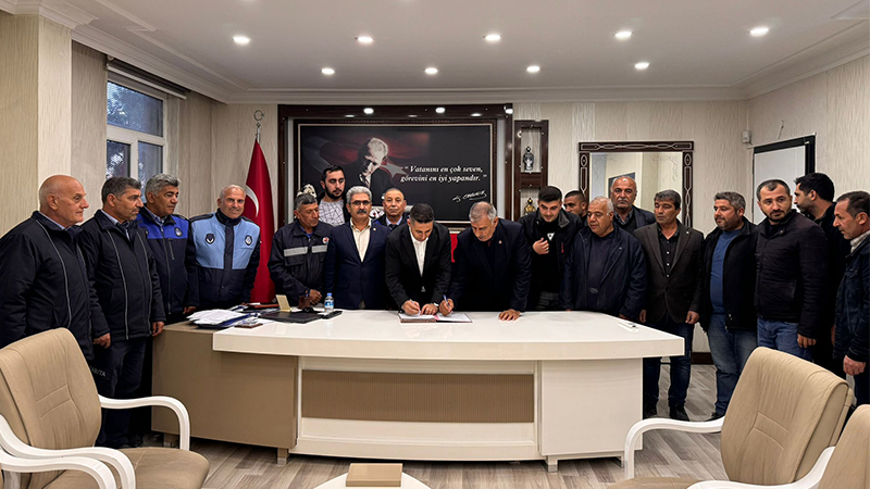 Suruç Kaymakamı ve Belediye Başkan Vekili İbrahim Güneş ile Belediye İş Sendikası Şanlıurfa Şube Başkanı Adem Şiltak arasında imzalanan toplu iş sözleşmesi, 2023-2026 yılları arasında geçerli olacak.