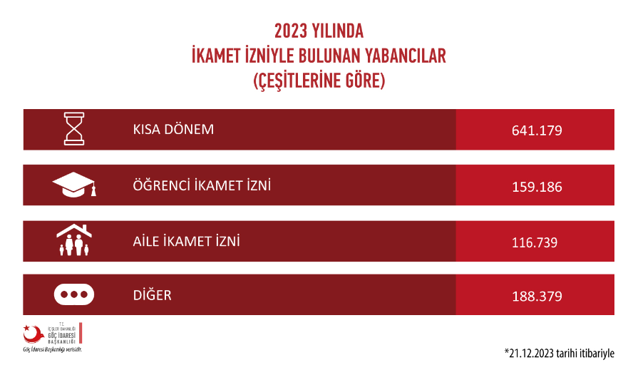 Göç İdaresi Başkanlığının paylaştığı ve son olarak 21 Aralık 2023’te güncellenen verilere göre, Türkiye’de ikamet izni ile bulunan toplamda 1 milyon 105 bin 483 yabancı uyruklu kişi var.