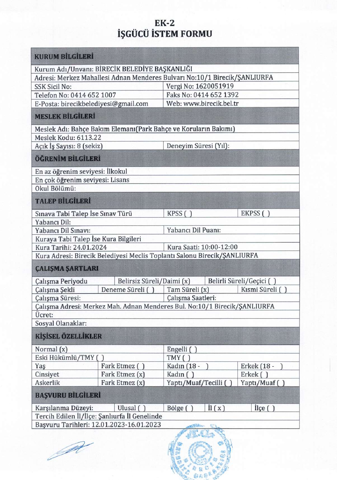 Birecik Belediyesi yeni personel alımı için ilan yayımladı.
