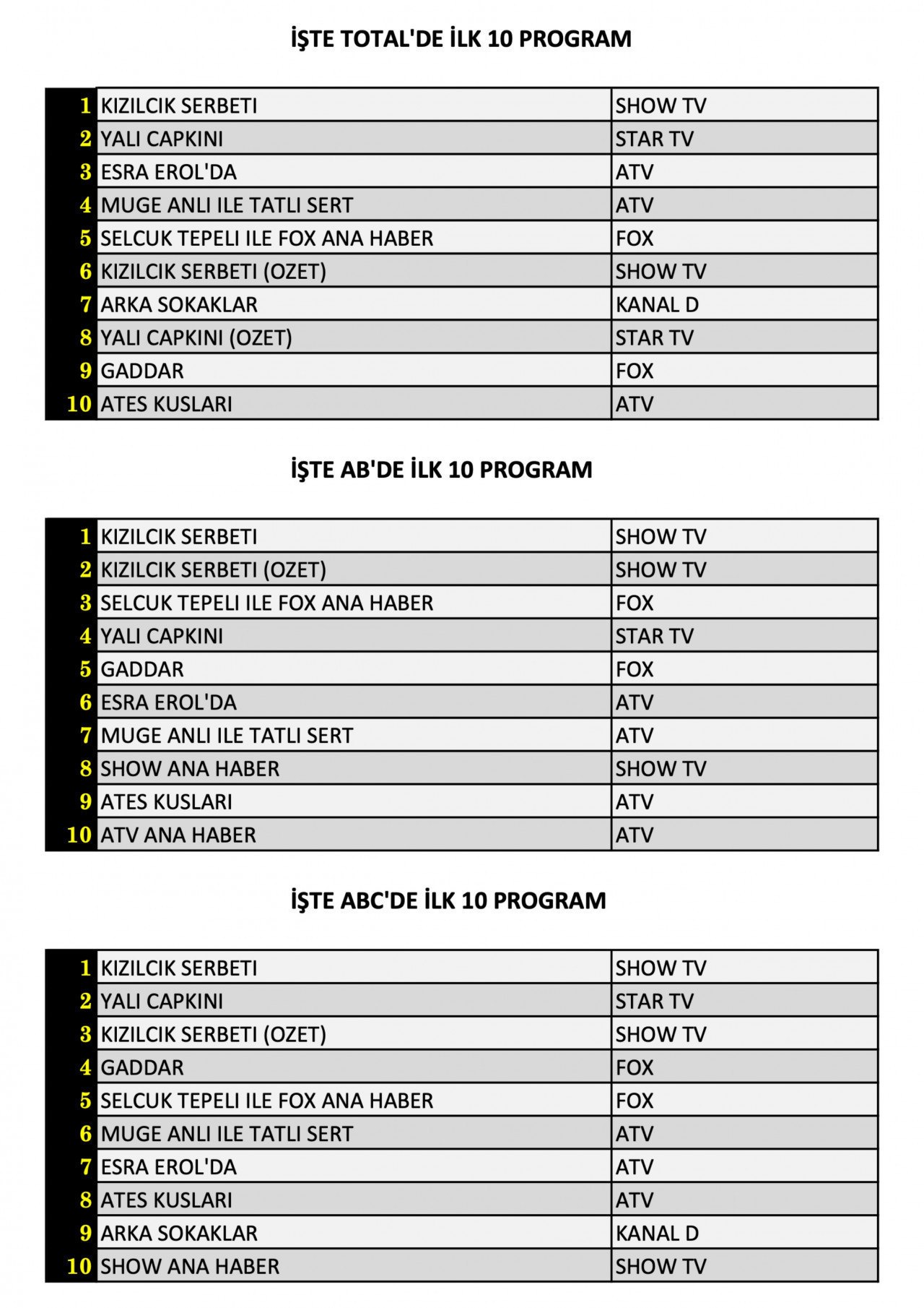 Total’de birinci sırada Show TV’de izleyici ile buluşan 'Kızılcık Şerbeti', ikinci sırada Star TV’de ekranlara gelen 'Yalı Çapkını', üçüncü sırada ise ATV’de yayınlanan 'Esra Erol’da' programı yer aldı.