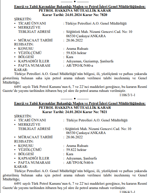Türkiye Petrolleri Anonim Ortaklığının, Şanlıurfa, Adıyaman ve Gaziantep illerinde bulunan 2 sahası için 5 yıl süreyle petrol arama ruhsatı verilmesi kararlaştırıldı.