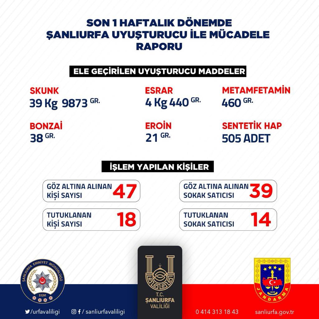 Şanlıurfa Valisi Hasan Şıldak, son bir haftada uyuşturucuyla mücadele kapsamında, yapılan çalışmaların bilançosunu açıkladı.