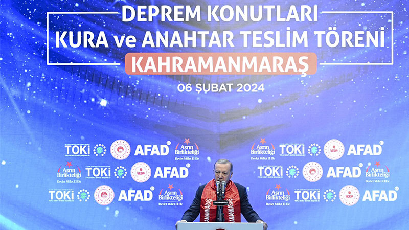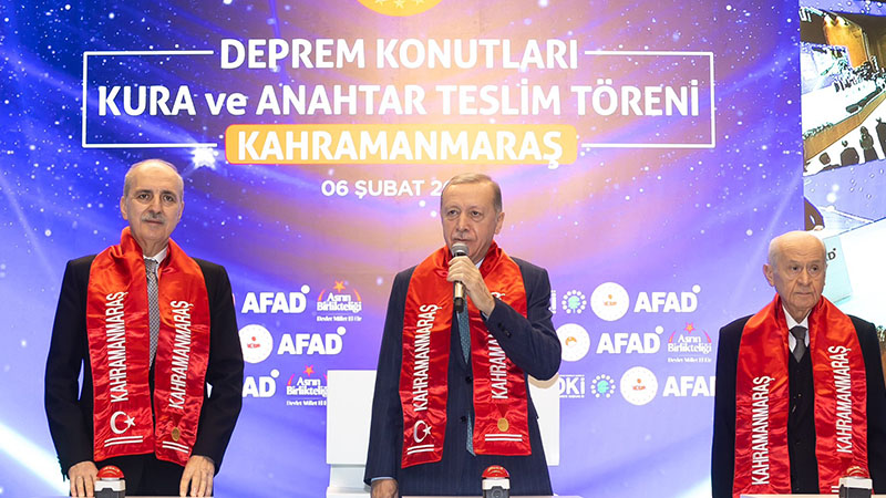 Deprem bölgesine acil ihtiyaçlar için 107 milyar lira kaynak aktardık. Kalıcı konutların inşasına da hemen başladık. İnşası biten ilk konutların anahtar teslimini geçtiğimiz günlerde Hatay ve Gaziantep’te yaptık. Bugün de Kahramanmaraş’ta 9 bin 289 konutumuzun kurasını çekiyor, anahtarlarını teslim ediyoruz. 20 bin konutumuzun yapımı hızla sürüyor. Hak sahibi 78 bin vatandaşımızın tamamına anahtarlarını teslim edene kadar gece gündüz durmayacağız.