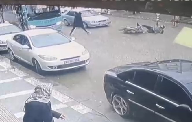 Olay yerindeki bir dükkanın güvenlik kamerası tarafından kaydedilen görüntülerde, kuryenin kaza sonrası yerde yatarken, iki kişinin altınları alıp kaçtığı görülüyor.