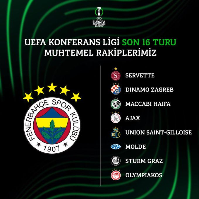 Konferans Ligi'nde Sturm Graz, Union Saint-Gilloise, Olympiakos ve Molde son 16 turuna kaldı. Bu dörtlünün yanı sıra Ajax, Maccabi Haifa, Servette Dinamo Zagreb Fenerbahçe'nin muhtemel rakipleri oldu.