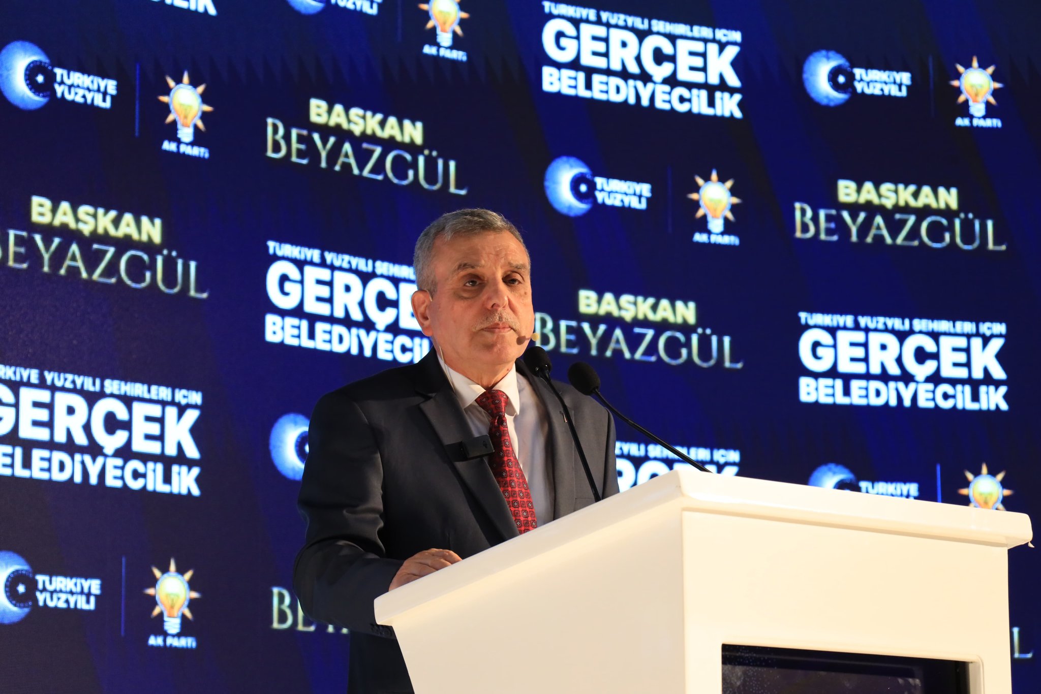 Saygı duruşu ve İstiklal Marşı’nın okunmasıyla başlayan program, ardından projelerin tanıtım videosunun izlenmesiyle sürdü. Daha sonra kürsüye çıkan Beyazgül, uzun süren bir konuşma yaptı.