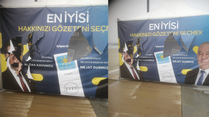İYİ Parti Büyükçekmece teşkilatının Zeki Pekcan Parkı'nda kurduğu seçim çadırı gece saatlerinde saldırıya uğradı. Çadırın dış cephesi yırtıldı.
