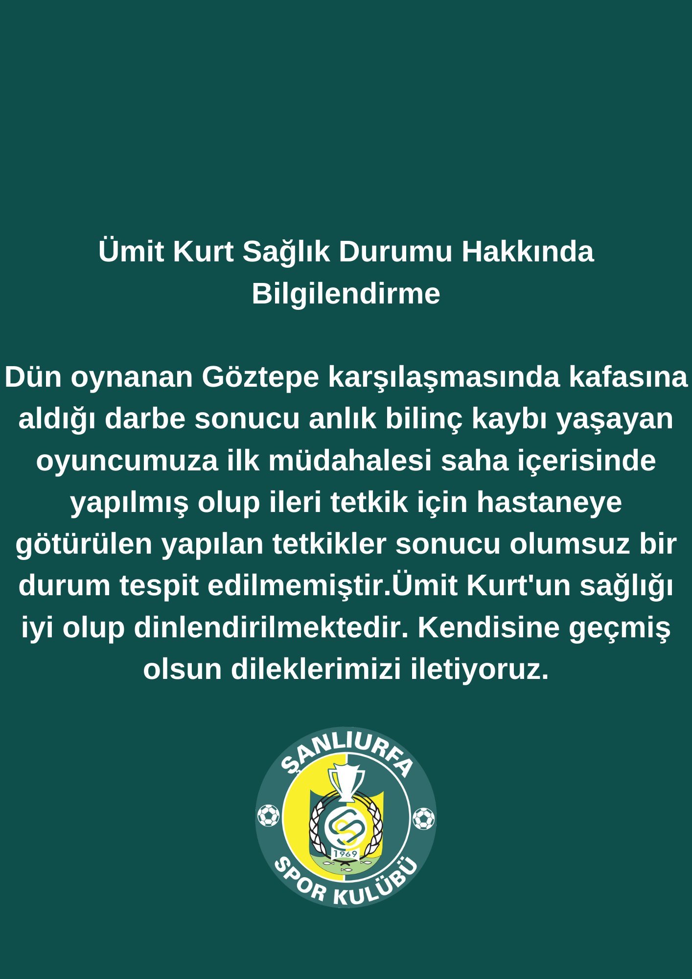 Sarı-yeşilli takım maçtan tek golle mağlup ayrılırken, maçın sonlarına doğru Ümit Kurt, rakibiyle girdiği mücadelede darbe alarak bilinç kaybı yaşamıştı. Hastaneye kaldırılan oyuncunun sağlık durumuyla ilgili Şanlıurfaspor kulübü açıklama yaptı.