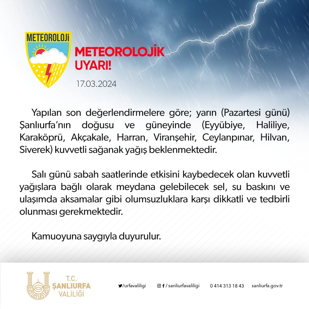 “Yapılan son değerlendirmelere göre; yarın (Pazartesi günü) Şanlıurfa’nın doğusu ve güneyinde (Eyyübiye, Haliliye, Karaköprü, Akçakale, Harran, Viranşehir, Ceylanpınar, Hilvan, Siverek) kuvvetli sağanak yağış beklenmektedir. Salı günü sabah saatlerinde etkisini kaybedecek olan kuvvetli yağışlara bağlı olarak meydana gelebilecek sel, su baskını ve ulaşımda aksamalar gibi olumsuzluklara karşı dikkatli ve tedbirli olunması gerekmektedir. Kamuoyuna saygıyla duyurulur”.