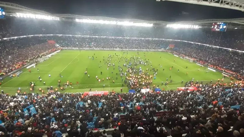 Karşılaşma sonrasında bordo mavili taraftalar sahaya girince, futbolcular ile taraftarlar arasında kavga çıktı.
