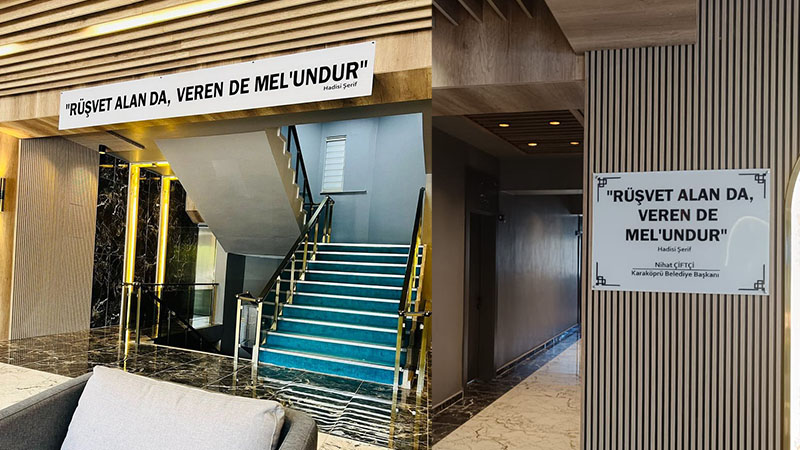 Yüzde 41 oy alarak Karaköprü Belediye Başkanı seçilen Nihat Çiftçi belediye binası girişine “Rüşvet alan da veren de mel’undur” Hadis-i Şerif yazısını astırdı.