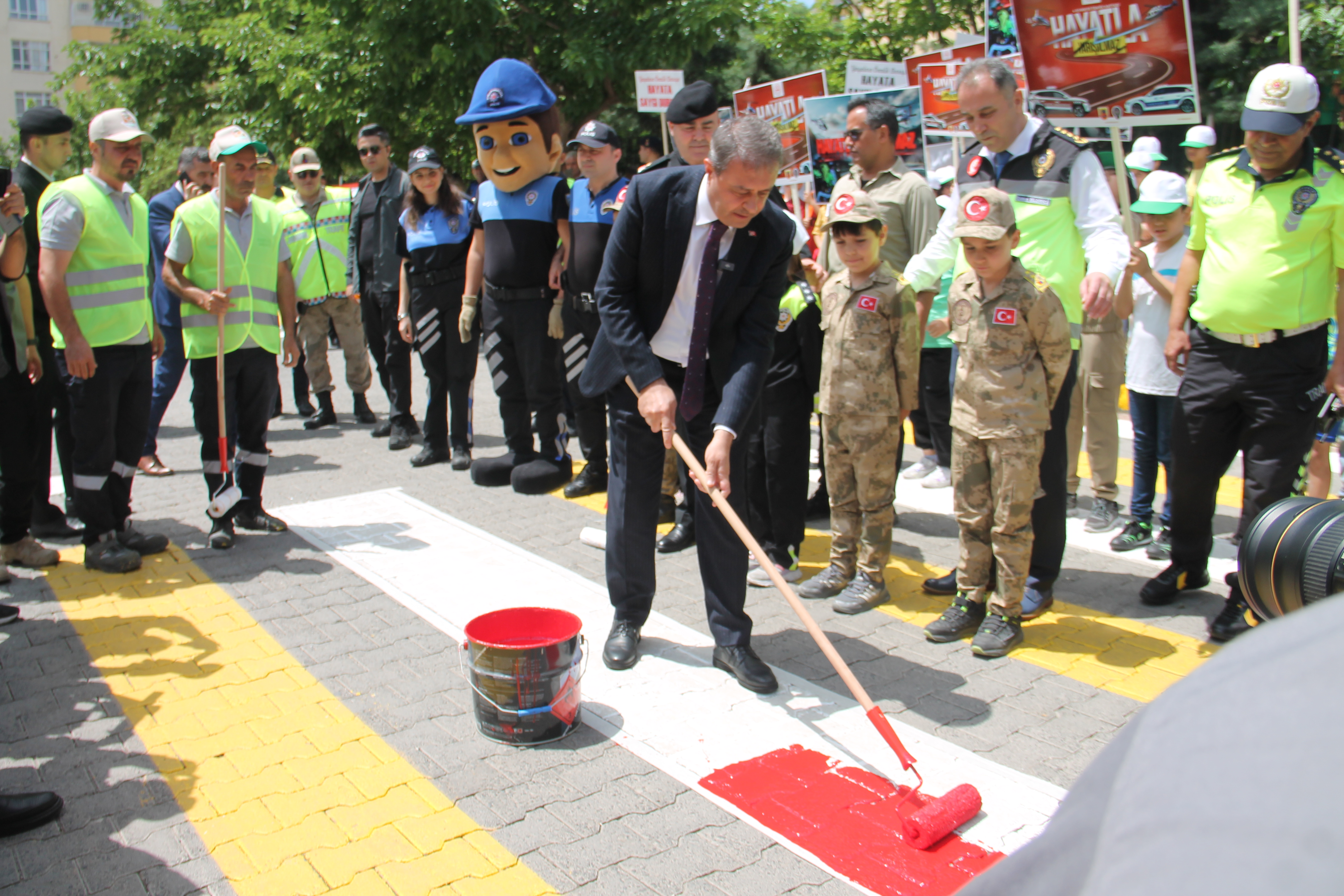 Düzenlenen etkinlikte, Vali Şıldak, Emniyet Müdürü Bildirici ve Jandarma Komutanı Avkıran, çocuklarla birlikte önce karşıdan karşıya geçti, ardından yolda bulunan yaya geçidini boyadılar.