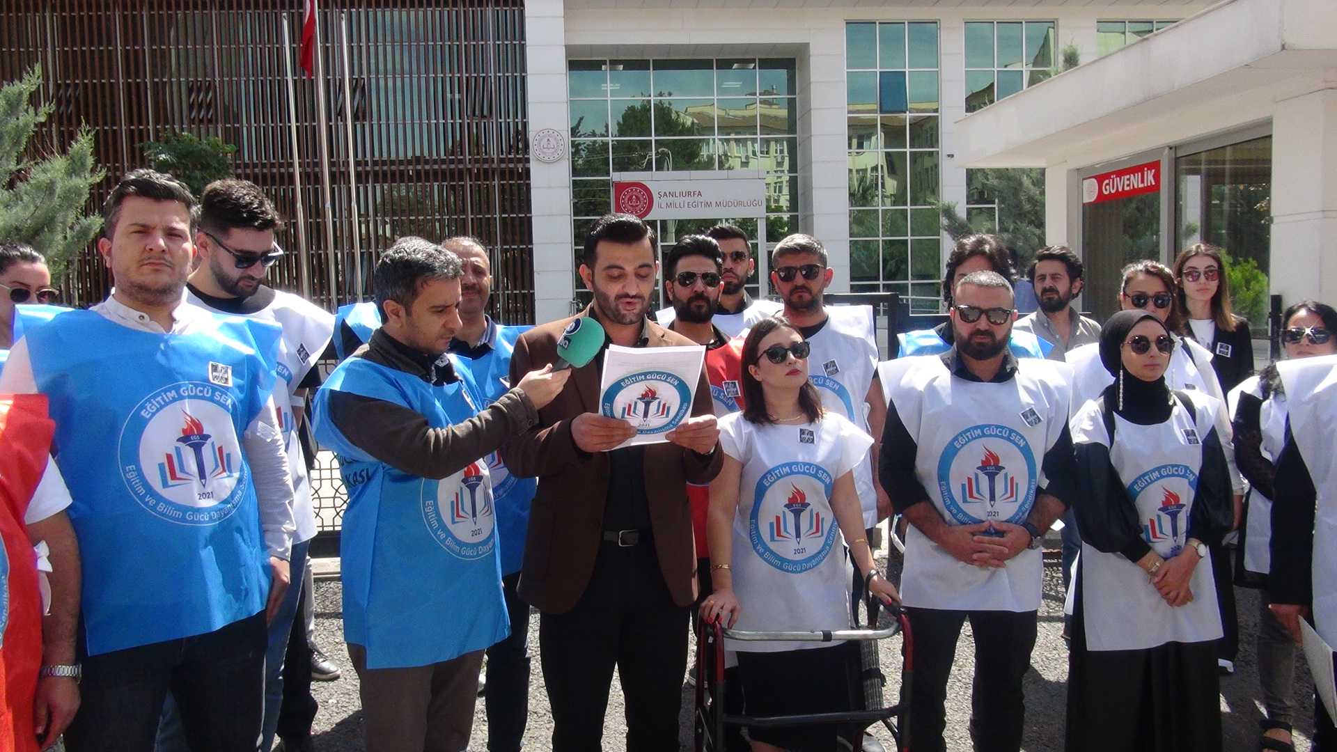 Şanlıurfa’da İl Milli Eğitim Müdürlüğü önünde toplanan Eğitim Gücü Sen Şanlıurfa Şubesi, burada basın açıklaması yaptı.