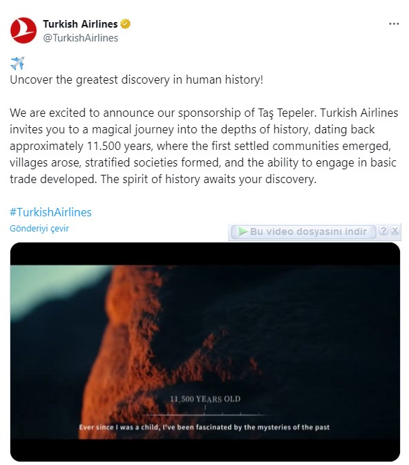 5 yıllık dev sponsorluk sözleşmesinin imzalanmasının ardından THY, Şanlıurfa'daki Taş Tepeler için hazırlanan tanıtım videosunu sosyal medya hesabından paylaştı.