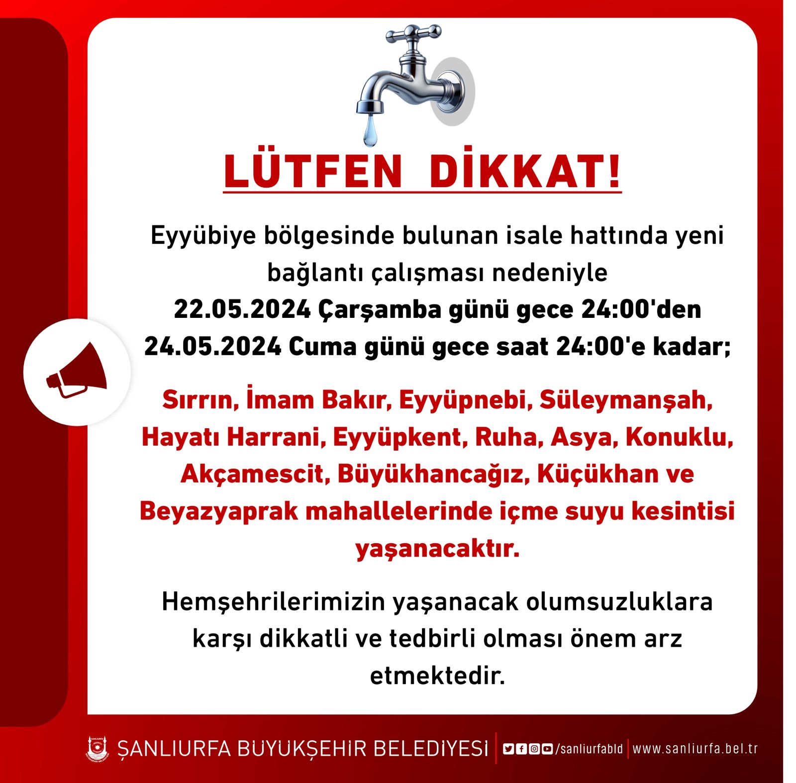 Su kesintisi, Sırrın, İmam Bakır, Eyyüpnebi, Süleymanşah, Hayatı Harrani, Eyyüpkent, Ruha, Asya, Konuklu Akçamescit, Büyükhancağız, Kuçükhan ve Beyazyaprak mahallelerinde yarın saat 24.00’de başlayıp Cuma günü saat 24.00’de kadar devam edecek.