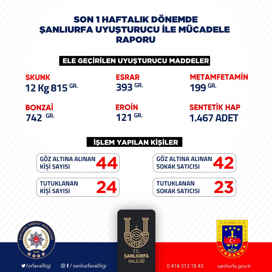 Şanlıurfa Valisi Hasan Şıldak, Şanlıurfa’da son bir haftada yapılan uyuşturucu denetimlerinin bilançosunu açıkladı.