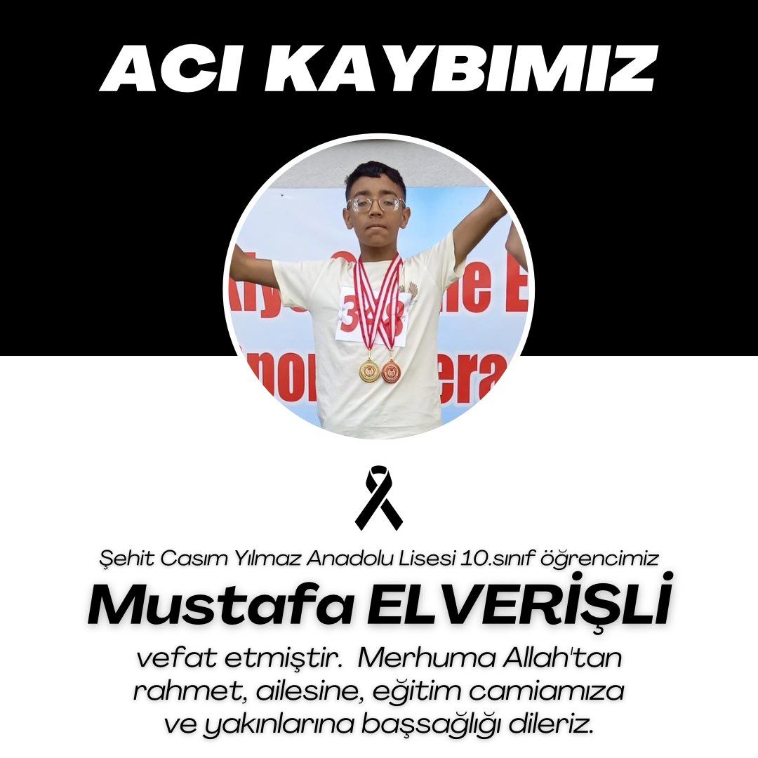 “Viranşehir Şehit Casım Yılmaz Anadolu Lisesi 10-C sınıfı öğrencimiz Mustafa Elverişli vefat etmiştir. Merhuma Allah’tan rahmet; ailesine, eğitim camiamıza ve yakınlarına baş sağlığı dileriz”.
