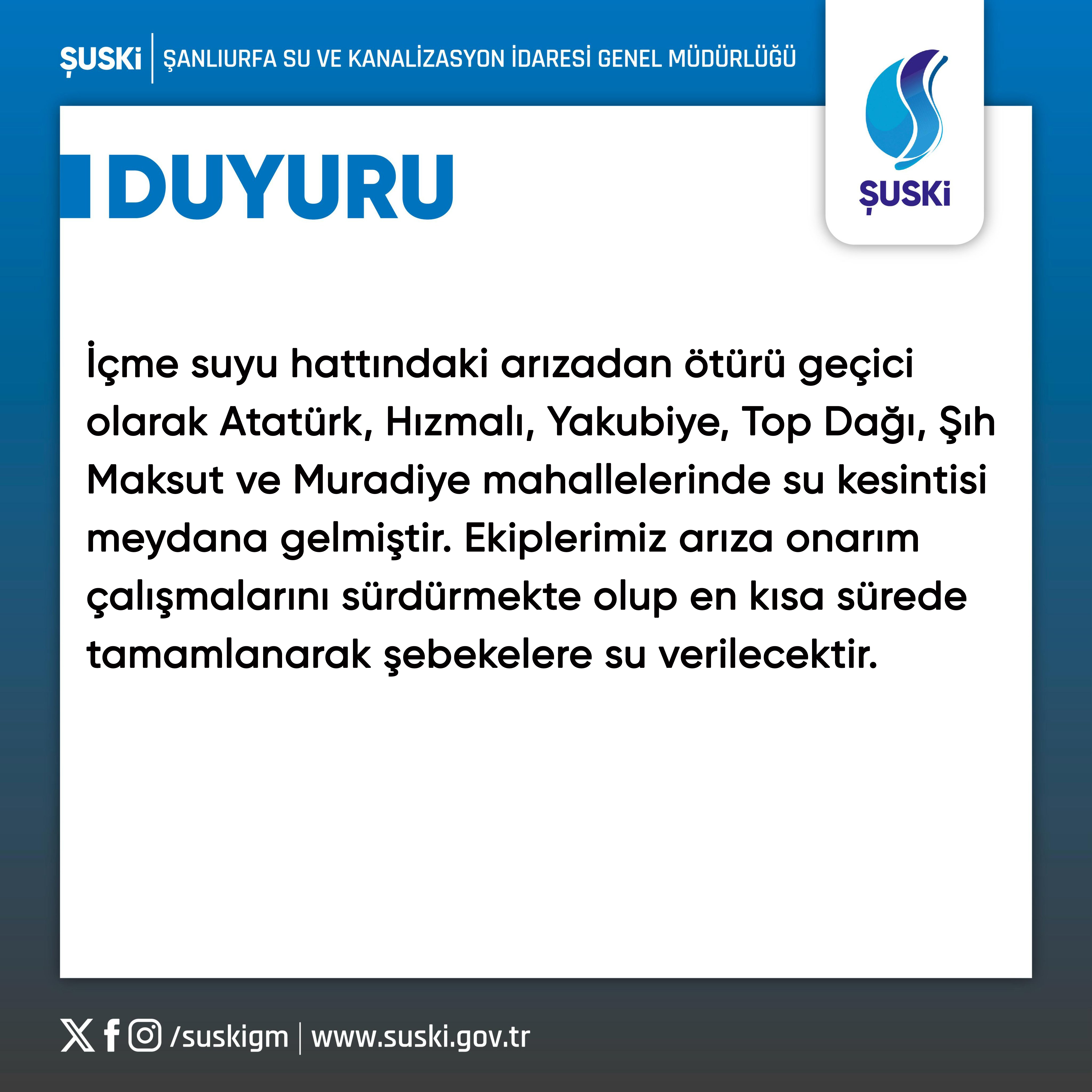"İçme suyu hattındaki arızadan ötürü geçici olarak Atatürk, Hızmalı, Yakubiye, Topdağı, Şıhmaksut ve Muradiye mahallelerinde su kesintisi meydana gelmiştir.