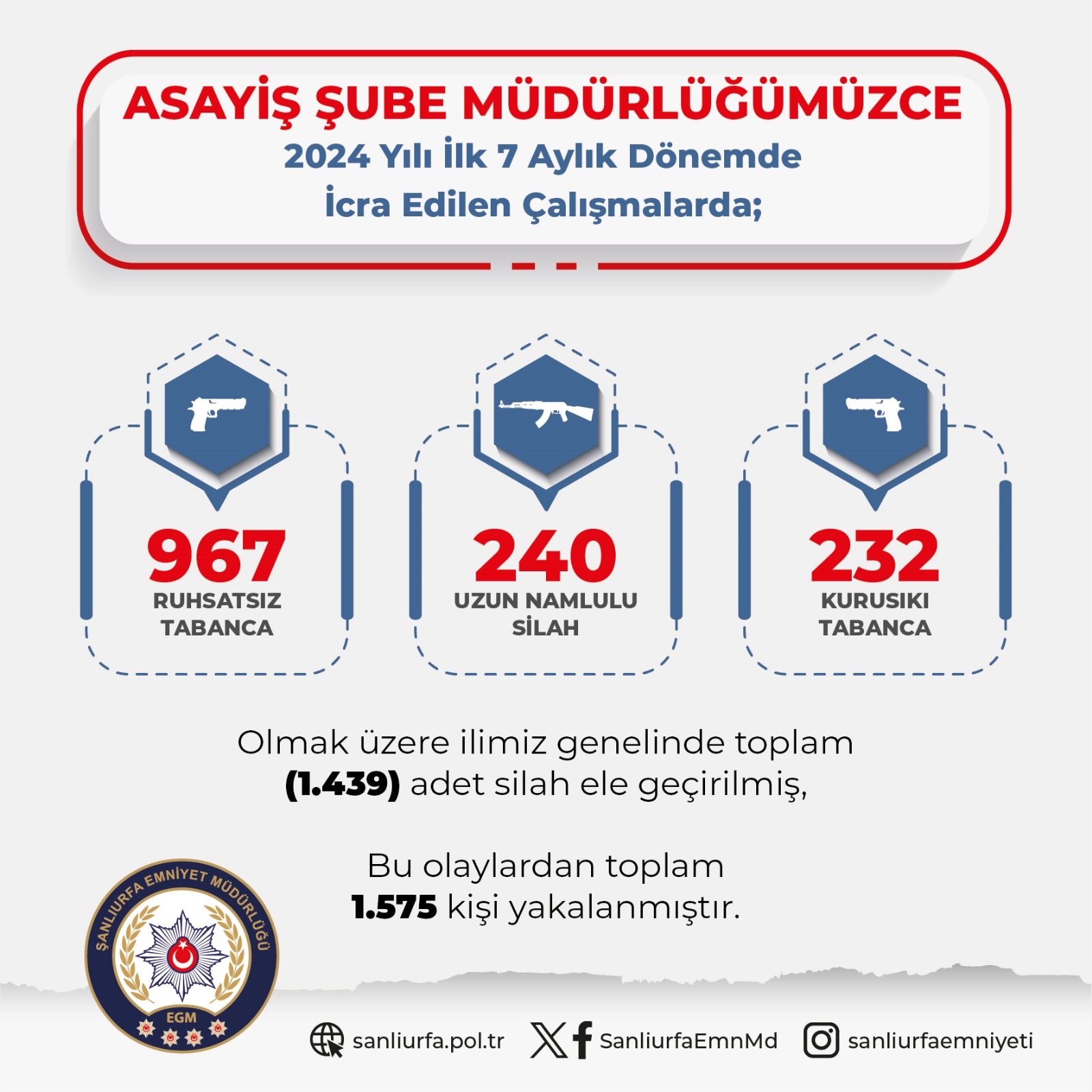 Şanlıurfa İl Emniyet Müdürlüğü ekipleri tarafından 7 ayda yapılan operasyonlarda 967 ruhsatsız tabanca, 240 uzun namlulu silah ve 232 kurusıkı tabanca olmak üzere toplam bin 439 silah ele geçirdi. Operasyonlar sonucunda bin 575 kişi yakalandı.