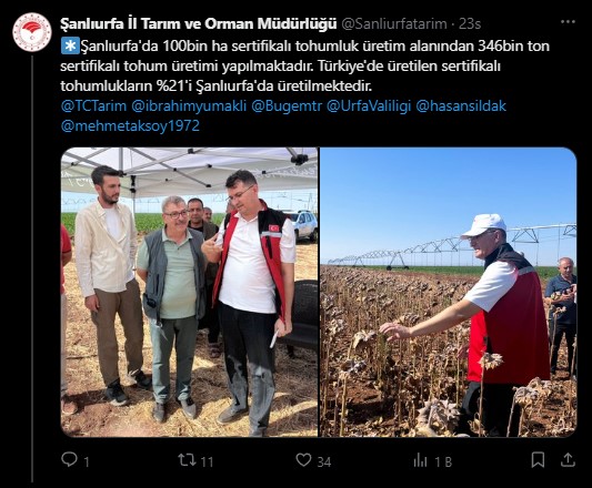 “Şanlıurfa'da 100 bin ha sertifikalı tohumluk üretim alanından 346 bin ton sertifikalı tohum üretimi yapılmaktadır. Türkiye'de üretilen sertifikalı tohumlukların yüzde 21'i Şanlıurfa'da üretilmektedir.