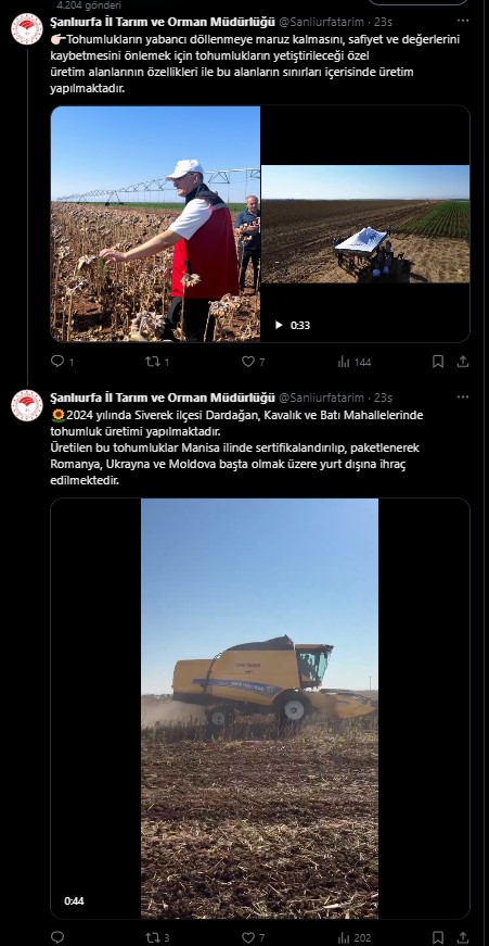 Açıklamanın devamında Siverek’te üretilen tohumların ilk etapta Manisa’ya sertifikalandırılmak üzere gönderildiği buradaki işlemin ardından yurt dışına ihraç edildiği kaydedilerek, “2024 yılında Siverek ilçesi Dardağan, Kavalık ve Batı Mahallelerinde tohumluk üretimi yapılmaktadır. Üretilen bu tohumluklar Manisa ilinde sertifikalandırılıp, paketlenerek Romanya, Ukrayna ve Moldova başta olmak üzere yurt dışına ihraç edilmektedir.” ifadeleri kullanıldı.