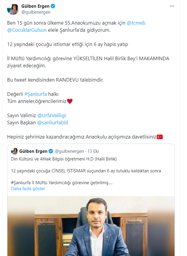 “Ben 15 gün sonra ülkeme 55. anaokulumuzu açmak için @tcmeb@CocuklarGulsun elele Şanlıurfa’da gidiyorum. 12 yaşındaki çocuğu istismar ettiği için 6 ay hapis yatıp İl Müftü Yardımcılığı görevine YÜKSELTİLEN Halil Birlik Bey’i MAKAMINDA ziyaret edeceğim. Bu tweet kendisinden RANDEVU talebimdir.