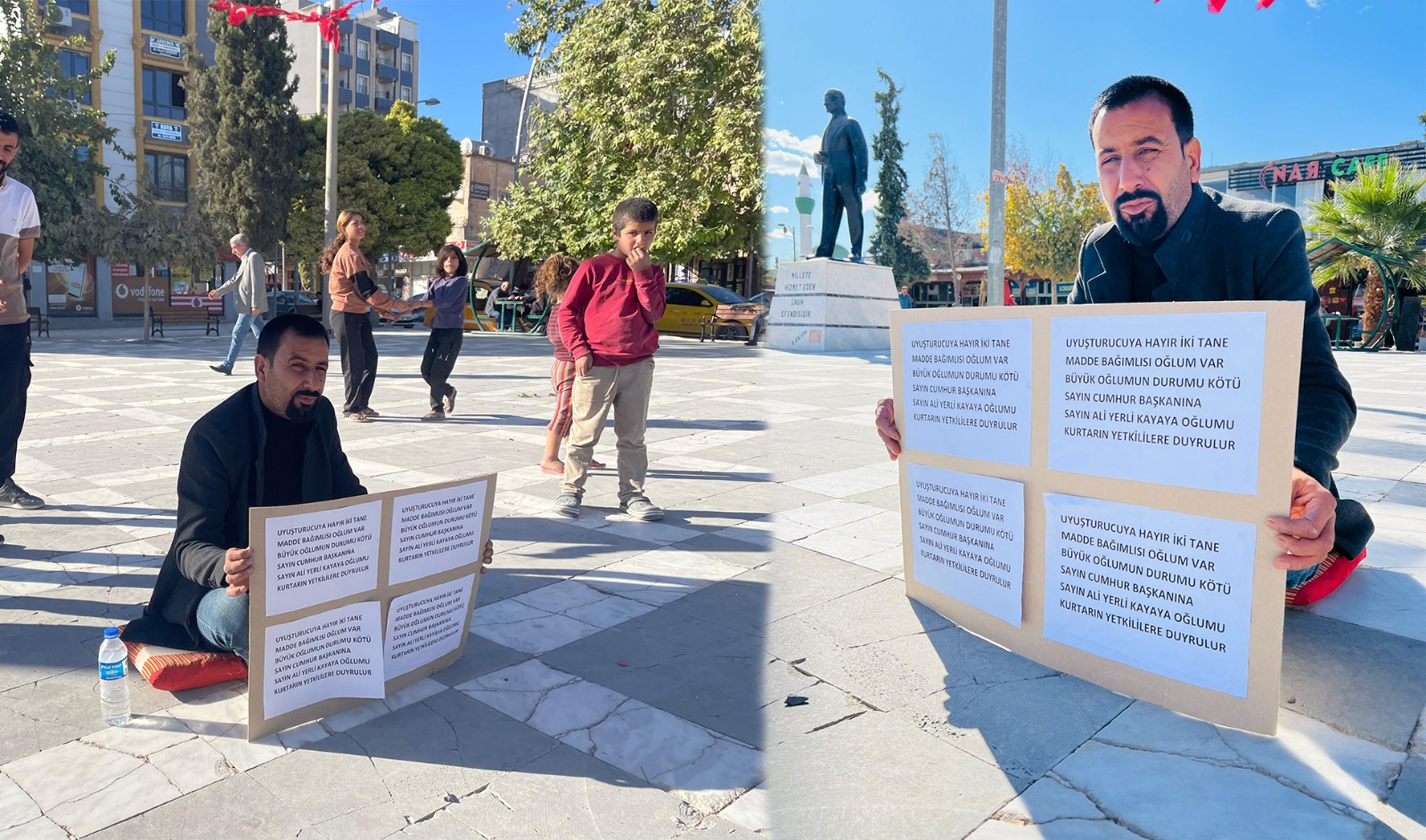 Şanlıurfa’nın Suruç ilçesinde iki çocuğu uyuşturucu bataklığına düşen Hüseyin Yılmazoğlu, yıllardır tek başına eylem yaparak yetkililerden yardım bekliyor.