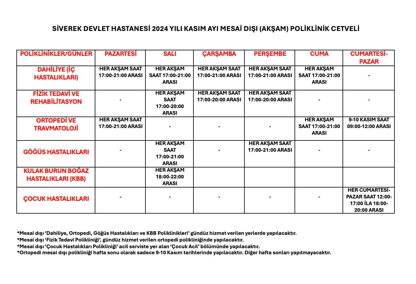Bu bölümlerden gün içerisinde sıra alamayan veya iş saatleri nedeniyle mesai saatleri içerisinde hastaneye gidemeyen hastalar mesai saatleri dışında Siverek Devlet Hastanesin poliklinik hizmetinden yararlanabilecek.