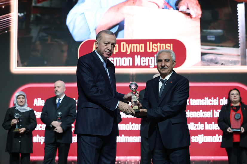 Cumhurbaşkanı Erdoğan, konuşmanın ardından "Kültür ve Turizm Bakanlığı Özel Ödülleri ile Yaşayan İnsan Hazineleri Ödülleri" sahiplerine verdi. 25 yaşayan insan hazinesi ve 3 sanat kurumu ödüllerine kavuştu. Ahşap oyma ustası Osman Nergiz de Cumhurbaşkanı Erdoğan'ın elinden "Yaşayan İnsan Hazineleri Ödülleri"ni aldı.