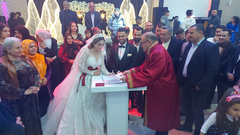 Törene Viranşehir Belediye Eş Başkanları Serhat Dicle İnan ve Bedriye Yorgun da katılarak nikah şahidi oldu. Evlilik cüzdanını geline takdim eden eş başkanlar, çifte mutluluklar dileyerek nikâhı resmiyete kavuşturdu.