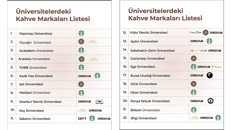 Bu iki kahve zincirinin farklı boykot listesinde bulunmasının ardından “Üniversitelerde hangi kahve zincirleri var?” sorusu gündeme geldi. Bu kapsamda Türkiye genelindeki birçok üniversitede hangi markaların hizmet verdiği araştırılmaya başlandı.