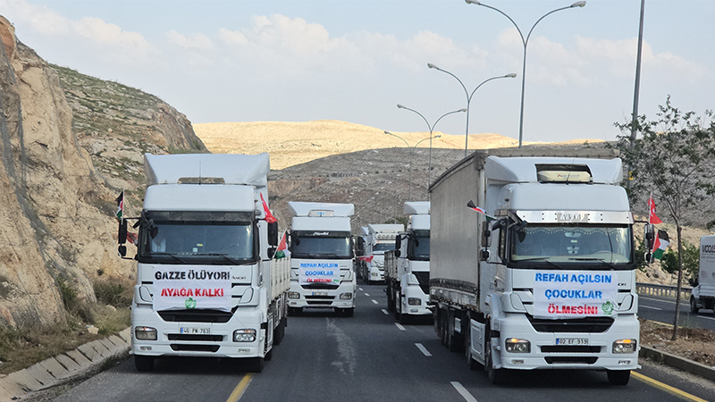 Üzerlerine "Refah Açılsın, Çocuklar Ölmesin" ve "Gazze Ölüyor, Ayağa Kalk!" pankartları asılan, Türkiye ve Filistin bayraklarıyla süslenen tırlar konvoy halinde yola çıktı.