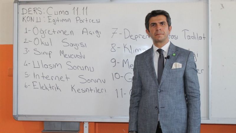 Şanlıurfa'nın eğitimdeki portresini sunmak için bir sınıfta yazı tahtasının önünde kameralar karşısına geçen HÜDA PAR Şanlıurfa İl Başkanı Emin Özaslan “HÜDA PAR olarak bu hafta eğitimde yaşanan sorunları ve bunlara yönelik çözüm önerilerini 11 madde halinde sıralayarak Şanlıurfa'nın eğitimdeki portresini sunacağız” dedi.