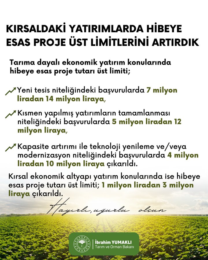 Tebliğle, tarıma dayalı ekonomik yatırım konularında hibeye esas proje tutarı üst limiti, yeni tesis niteliğindeki başvurularda 7 milyon liradan 14 milyon liraya, kısmen yapılmış yatırımların tamamlanması niteliğindeki başvurularda 5 milyon liradan 12 milyon liraya, kapasite artırımı ile teknoloji yenileme ve/veya modernizasyon niteliğindeki başvurularda 4 milyon liradan 10 milyon liraya çıkarıldı.