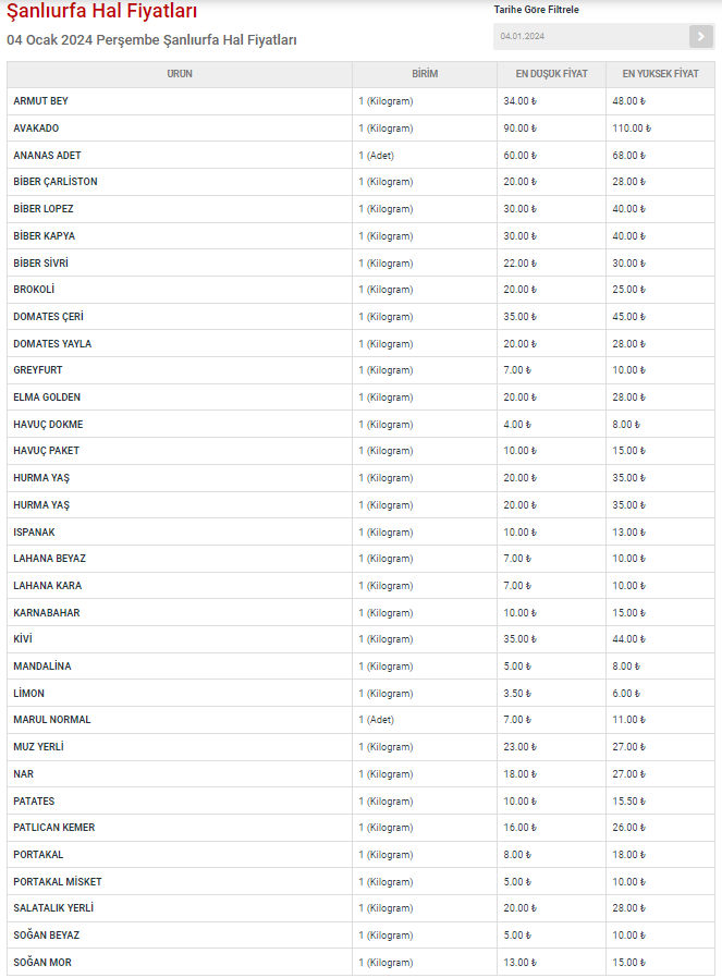 Şanlıurfa’da havaların soğuması nedeniyle seralarda yetiştirilen sebze ve meyvelerin üretiminde düşüş yaşanırken, dışarıdan gelen ürünlerin fiyatları da nakliye maliyetlerindeki artış nedeniyle yükseldi. Peki Şanlıurfa’da hal fiyatları ne durumda? Şanlıurfa’da yaş sebze ve meyve halinde 4 Ocak Perşembe günü en ucuz ürün limon oldu. İşte Şanlıurfa hal fiyatları…