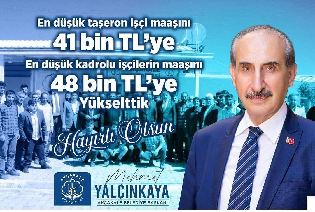 31 Mart'ta yapılacak seçimlerde Yeniden Refah Partisi'nden aday olan Akçakale Belediye Başkanı Mehmet Yalçınkaya, belediye bünyesinde çalışan taşeron işçilerin maaşını 41 bin TL'ye, kadrolu işçilerin maaşını ise 48 bin TL'ye çıkardıklarını açıkladı.