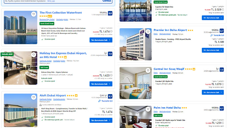 Doha'da bir gecelik otel fiyatları 1000 TL ile 2000 TL arasında iken, Dubai'de 1000 TL ile 2000 TL arasında konaklama yapmak mümkün.